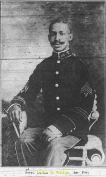 Not a great deal of biographical information is available about Lucian Bottow Watkins (1879-1921), who generally published as Lucian B. Watkins. Watkins himself writes a brief memoir as the Preface to his one published book of poetry, Voices of Solitude (1907), which can be found here. He indicates he was born in Chesterfield County, Virginia, and received a basic education as a young man at the Virginia Normal and Collegiate Institute. He graduated and received certification as a teacher in 1897. He only taught for two sessions (perhaps about a year?), and then left teaching to work as a waiter at a series of hotels in Virginia, Pennsylvania, and Maryland, before enlisting in the Army in 1900. From his poems, we see that Watkins was stationed at Fort Clark, Texas, and Fort Washakie, Wyoming. He was also stationed in the Philippines in 1900-1901 before returning to the U.S. Starting in 1901, he started publishing essays and poetry in venues such as Colored American Magazine, Richmond Planet (a weekly newspaper), McGirt's Magazine, and Alexander Magazine. Watkins describes himself as re-enlisting in 1903, and being sent for a second time to the Phillippines.
